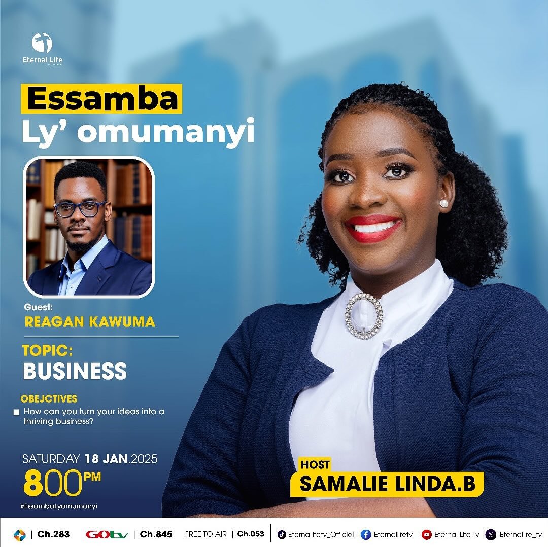 I’ll be joining the lovely Samalie Linda.B on her show “Essamba Ly’ omumanyi” this Saturday, January 18th at 8 PM! We’ll be talking about how to turn your ideas into a thriving business—because who doesn’t love a good transformation story? 😄Expect laughs, tips, and some real talk on making your dreams a reality. 💼✨ So grab your popcorn, tune in, and let’s get inspired together!📺 Catch it on Eternal Life TV (Ch.283 StarTimes, Ch.845 GoTV, Ch.053 Free to Air). Don’t forget to tell a friend to tell a friend!